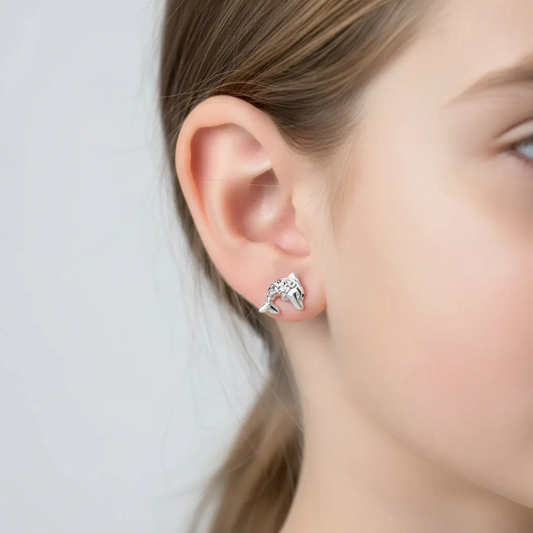 Wunderschöne Ohrstecker Delfin aus 14 Karat Weissgold und weissem Glas verziert.